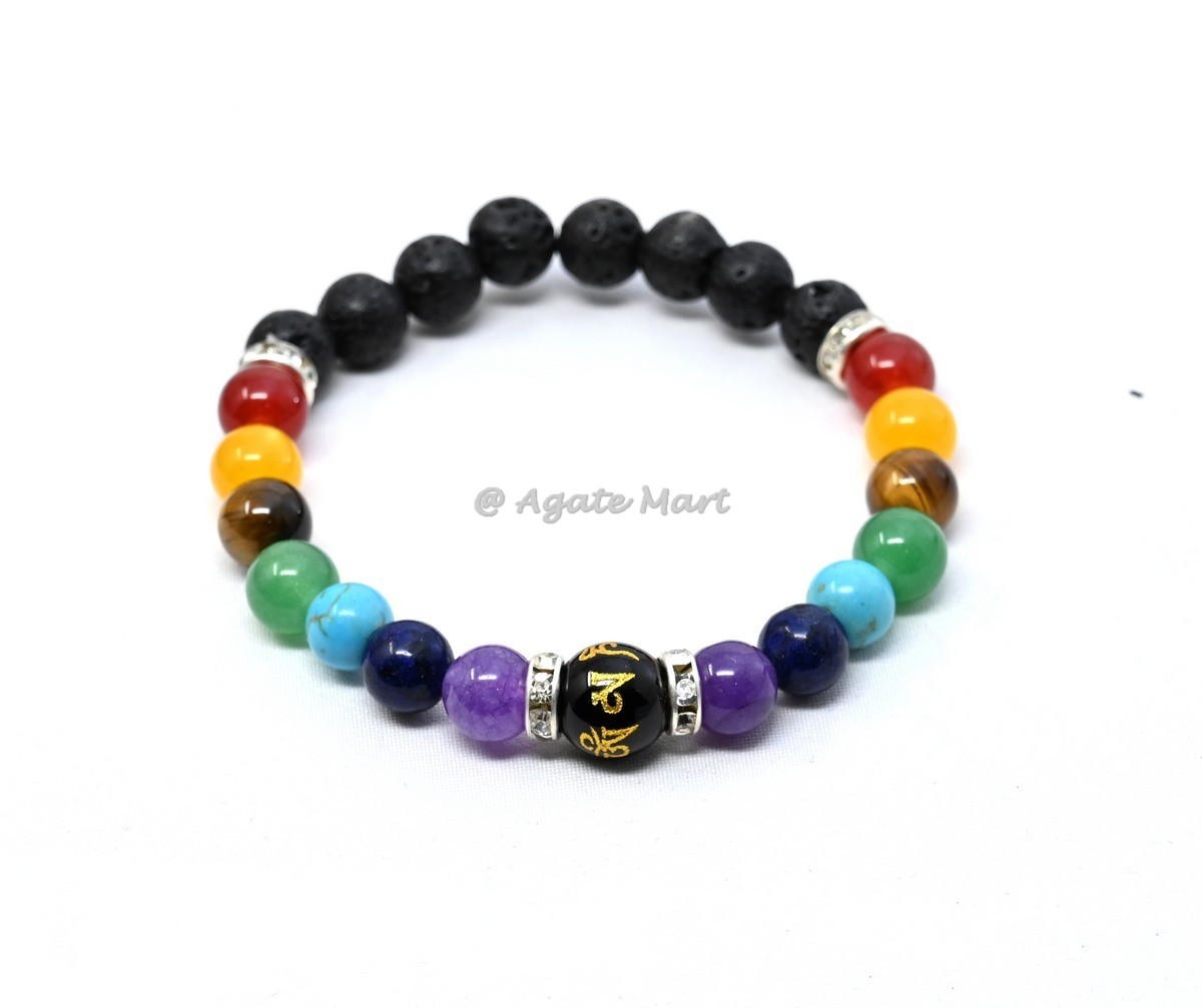 Achieve holistic healing with our 7 Chakra With Lava Stone And Home Mani Bracelet. This unique bracelet combines the balancing properties of chakra stones with the grounding energy of lava stone. Each stone is carefully selected to ensure maximum effectiveness, helping to align and balance your chakras. Lava stone is known for its grounding properties, making it an ideal choice for those seeking to connect with the earth`s energy. This bracelet is perfect for those looking to enhance their spiritual and emotional well-being. Ideal for wholesale buyers looking for high-quality, unique chakra jewelry, this bracelet is a standout piece that offers both beauty and functionality. Available in bulk for great savings, making it an excellent choice for retailers and resellers. Order now from Agate Mart and experience the benefits of holistic healing with this beautiful chakra and lava stone bracelet.