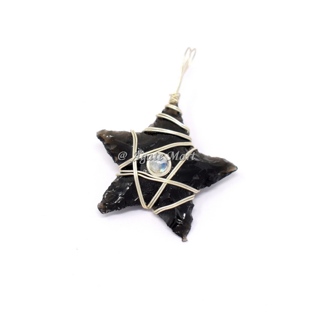 Book an order for Black Obsidian Star With Moonstone Wire Pendant at Agate Mart. Black Obsidian Stone is a powerful cleanser of psychic smog created within your aura, and is a strong psychic protection stone. This stone has powerful metaphysical properties that will help to shield you against negativity. The energy of these stones may stimulate the gift of prophesy and may boost precognition. Obsidian is a very historical gemstone that has been used as a good luck charm from ancient times. This gemstone is good for people that can be influenced easily or people with sensitive heart. Obsidian can return negative energy to the earth because it has very strong connection with the earth, especially lava.