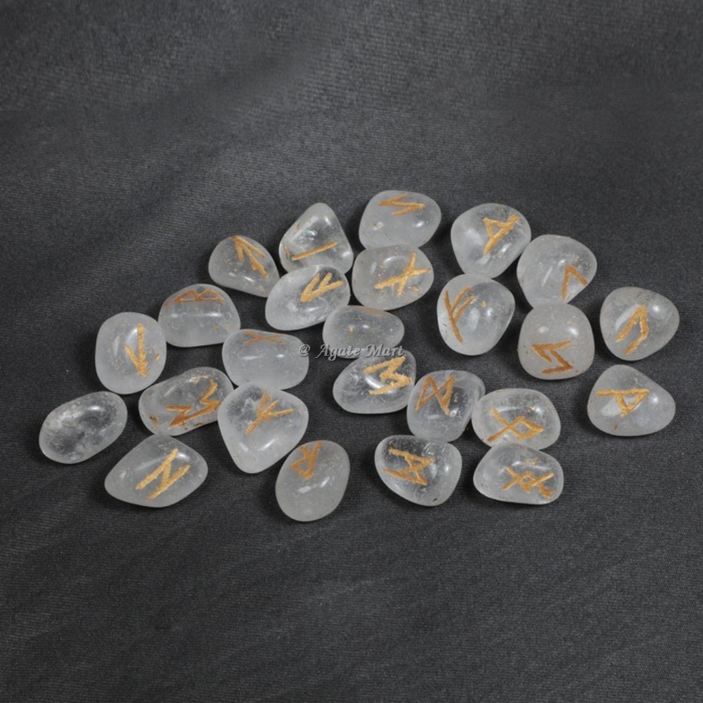 Order online for Crystal Quartz Rune sets at affordable prices. This beautiful sets of runes are hand-crafted using a sets of tumbled and polished Crystal Quartz stones. Quartz is also beneficial for storing and retrieving information of all types, as information is a form of energy pattern also. This makes them particularly good for programming to use for a particular purpose. It is used for psychic protection because it counters black magic and protects from negative energy. It is very useful on the third eye chakra for clarity of psychic vision and can be used to communicate with spirits and other worlds. Quartz is a stone that can access ancient wisdom and bring it into the present. It is a very good stone for astral travel, manifestation, scrying, channeling, dream recall and dream work. Order online now.