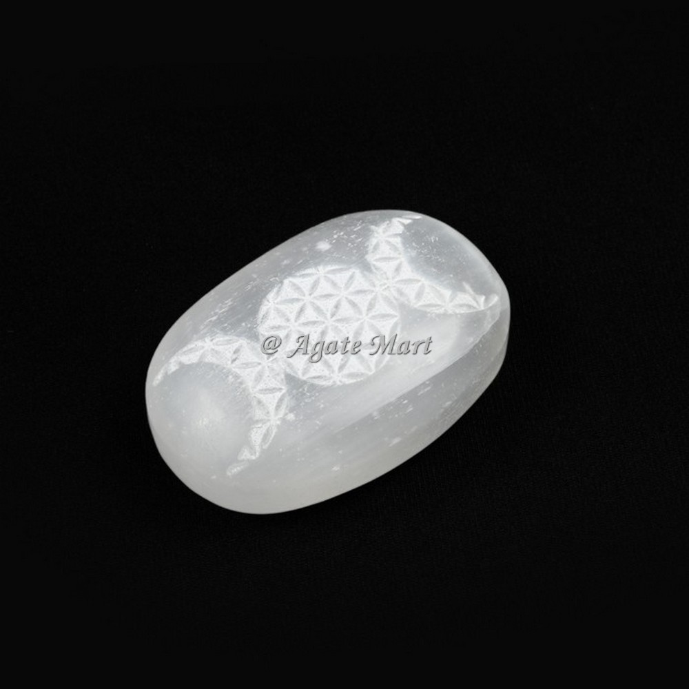 Browse our online collection of Selenite Flower Of Life Palm Stone. Selenite brings mental clarity, clearing confusion and revealing the bigger picture behind problems. A protective stone, Selenite shields a person or space from outside influences. Selenite can evoke protection from the angelic realm and also dispels negative energy. Selenite is a crystallized form of gypsum. The meaning behind the Flower of Life symbol is that it is accepted to speak to the cycle of creation. What`s more, Flower of life is giving the internal quality in body. It portrays how all life comes from one singular source - represented by the circle in the middle of the pattern. It is said to hold the most significant and sacred patterns of the universe. This Selenite Palm Stone are available in wide range and best quality.