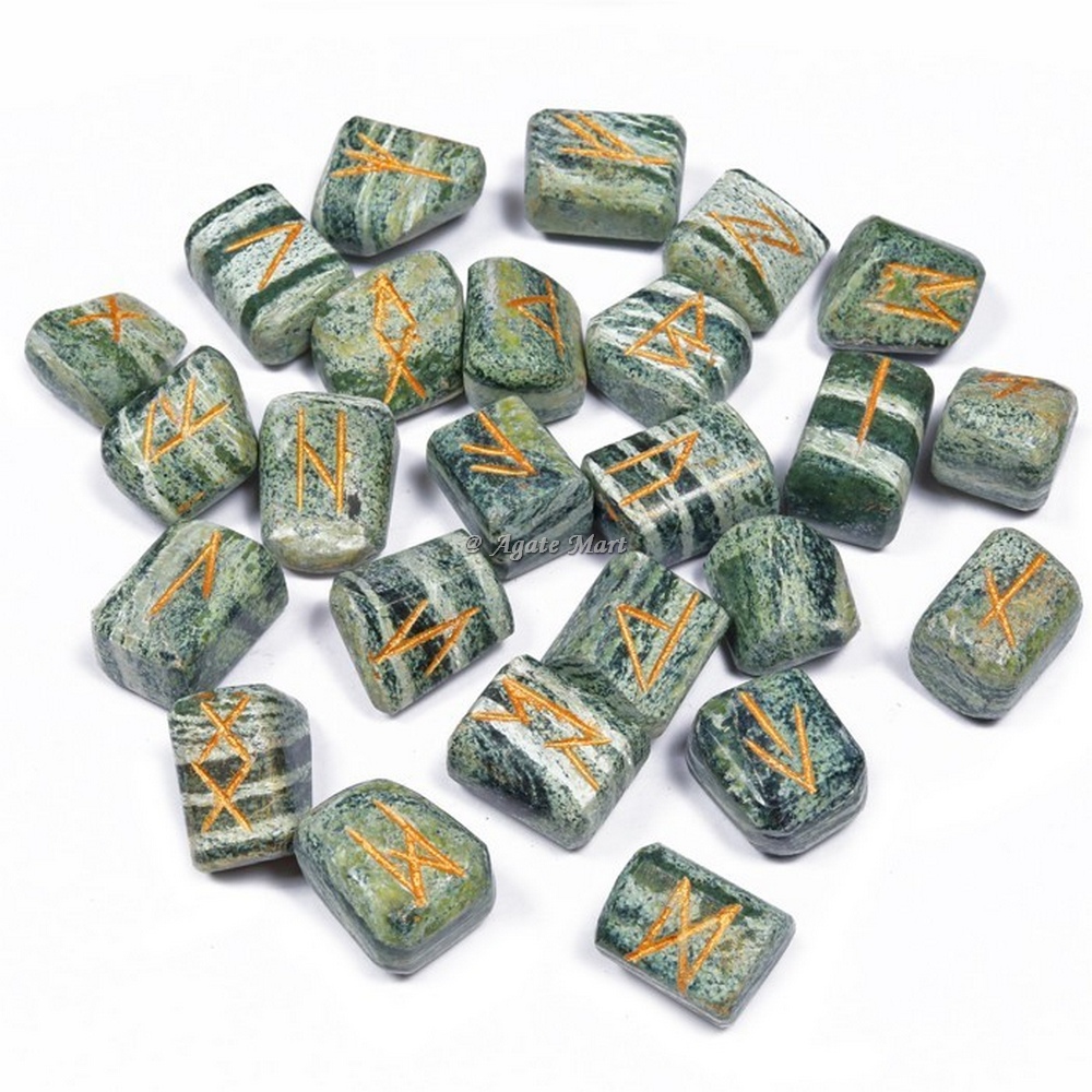 Buy Green Zebra Jasper Rune Sets Online at low prices. Green Zebra Jasper helps to protect relieve sexual problems in males such as "ED" or low libido. Green Zebra Jasper helps to increase estrogen levels in woman increasing sexual desire and helps with conception. Runes are the letters in a set of related alphabets known as runic alphabets, which were used to write various Germanic languages before the adoption of the Latin alphabet and for specialised purposes thereafter. For placing special order for Green Zebra Jasper Rune Sets contact us directly.