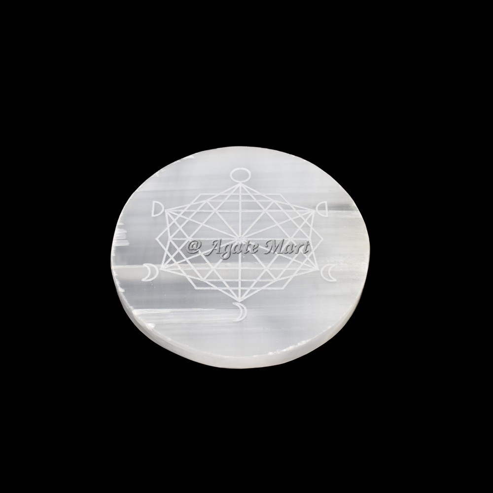 Check out the most unique collection of Moon Phase Metratron Selenite Charging Plate on Agate Mart. Selenite is a calming stone that instils deep peace and is excellent for meditation or spiritual work. It assists judgement and insight. It clears confusion and aids in seeing the deeper picture. Selenite aligns the spinal column and promotes flexibility. The Flower of Life is a symbol composed of many overlapping circles in a pattern resembling a flower. It is said to hold the the most significant and sacred patterns of the universe. Place the order as soon as possible.