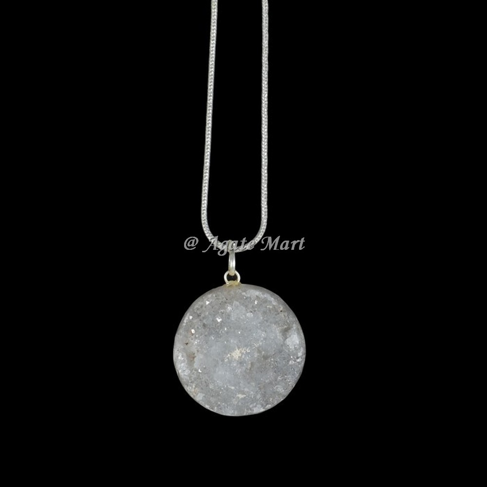 Browse Our Round Shape Druzy with Silver Chain Pendant For Sale.It is also well-known as ?The Gemstone of Heaven.?Its meaning impact on the person`s body and mind helped one to get the most elevated wisdom. Most people believe that Druzy helps its user to calm down, thereby eliminating anxiety levels.Order Long Druzy with silver chain Pendant Now.
