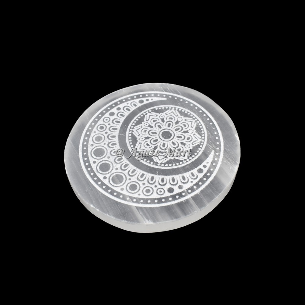 Buy Selenite Healing Flower of life Charging Disk from Agate Mart now. The Flower of Life provides enlightenment to those who study the symbol and its perfect form. Certain variations of the Flower of Life hold different meaning and significance. The Seed of Life is formed with seven overlapping circles that create a more singular flower design. Said to be the basic template for everything in existence; all geometric forms can be found within it, including sacred geometry shapes like the Platonic Solids, Metatron`s Cube, and the Merkaba. The Flower of Life symbolizes creation and reminds us of the unity of everything: we`re all built from the same blueprint. Selenite, also known as satin spar, desert rose, or gypsum flower are four crystal structure varieties of the mineral gypsum. These four varieties of gypsum may be grouped together and called selenite. Selenite is a crystallized form of Gypsum, which is used for good luck and protection. The powerful vibration of Selenite can clear, open, and activate the Crown and Higher Chakras and is excellent for all types of spiritual work. Selenite can also be used to strengthen the memory.