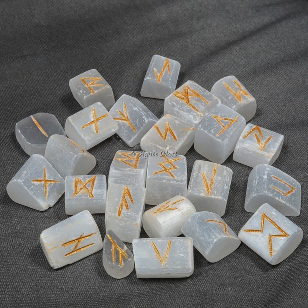 Agate Mart offers you top quality Selenite Rune Sets. Selenite is a stone of truth and honesty. This clarity enhances mental flexibility and enables strong decision making abilities. Selenite opens and activates all chakras,cleanses the auric field and clear energy blocks. Selenite can also be used to cleanse other stones. Runes are the letters in a set of related alphabets known as runic alphabets, which were used to write various Germanic languages before the adoption of the Latin alphabet and for specialised purposes thereafter. Gemstone runes are pleasingly heavy when cast, and undeniably beautiful to work with. Runes are made with precious gems, semi-precious stones, or even ordinary pebbles. Rune stones, they say, are a modern, New Age invention. Shop online from Agate Mart.