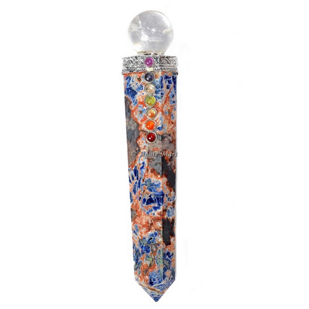 Agate Mart offer extensive variety of Sodalite 7 Chakra Healing Wands at Wholesale cost. This astounding sodalite Healing Wands are utilized to control an enthusiastic adjust and mollusk in freeze assaults. Likewise it is the solid vibration of truth. It is accessible in mass amount. The chakras consist of seven key points in the body?vortexes of energy that run through the spine. Order online now.