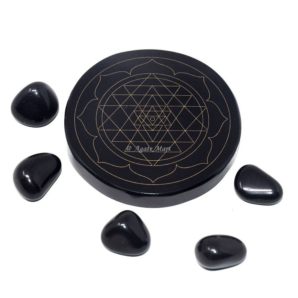 Yantra Engraved Coaster On Black Agate