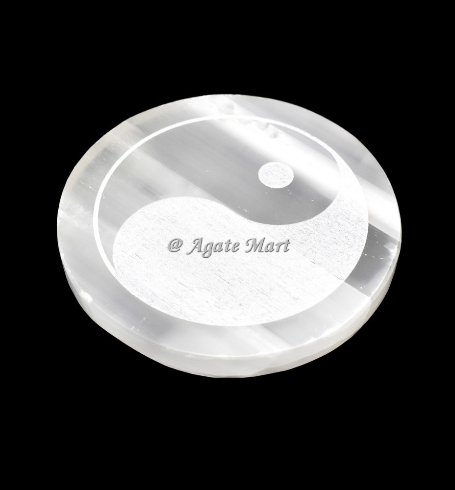 Browse the uniquely Designed collection of Yin Yang Etched Selenite Charging Plate. Selenite evokes protection from the angelic realm, helping to dispel all negative energy from the body and mind. It is known to bring deep peace and mental clarity. This Yin Yang Etched Selenite Charging Plate will magnify the energy of anything that is placed upon them. Combine them with other crystals to amplify the desired intention, or try creating a rainbow plate by setting a series of colorful tumbled stones along the tile. This energy field is amplified in it?????????s natural form. This is why we chose to carry only natural plates of selenite. The act of cutting and polishing the selenite which is destined as a charging plate decreases its energy. We select the plates which are removed from the Earth in their natural state. By simply holding these plates a sensitive individual can feel the difference. Low vibrational energies attract negativity on the same level. Raising your vibration is essential to keeping feelings of grief, fear, anger and anxiety out of your mental and physical space. If you?????????ve been doing a lot of work with crystals during times of stress or emotional turmoil, don?????????t forget to release that energy from them using Selenite.