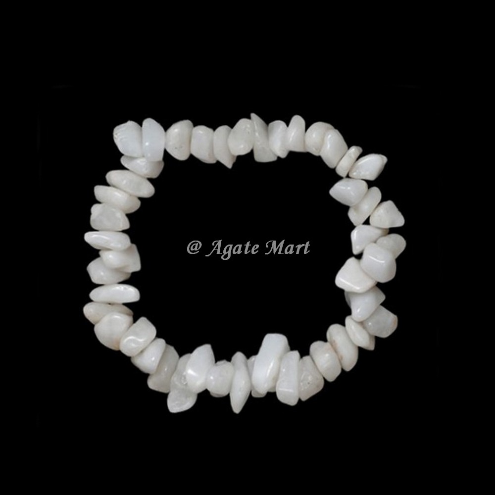 Buy amazing Quality White Agate Chips Power Bracelet from Agate Mart. White Agate is a Milky colour stone with patterns. White colour is a symbol of Peace and serenity. White Agate Bracelet helps in peace of the mind and the body transforming negative energy to positive one. We offer White Agate Stone Chips with special cutting, shine, and texture for decoration. Our white agate chips are widely demanded various decorative applications of any landscape including homes, parks, aquaria and artistic monuments. Order online now.